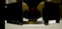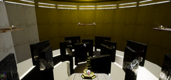 One room focused on open room combat with ramps, cover along the perimiter and full-auto weapons